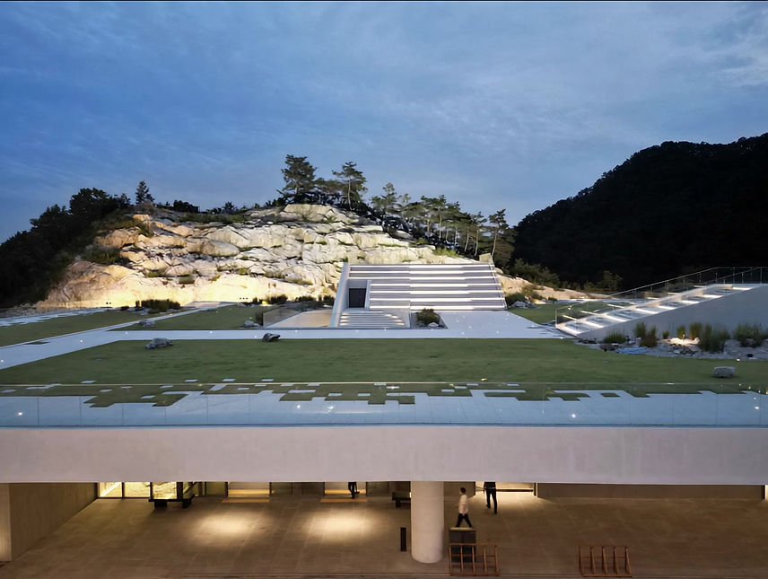 그 뒤에 자리 잡도록 함으로써 개발로 인해 흐트러진 지형을 연결하는 지형적인 건축을 만드는 것이었다.